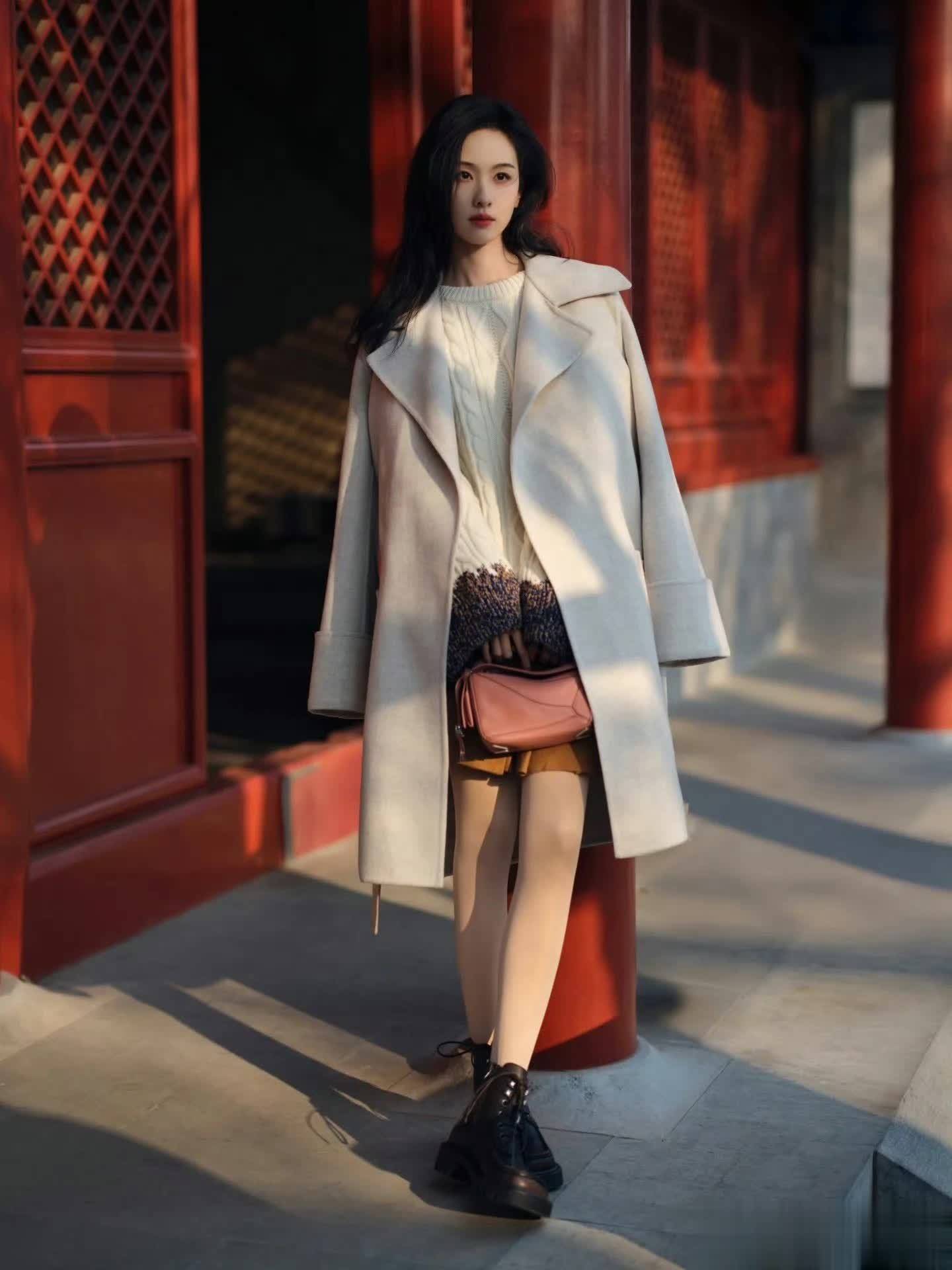 材质混搭,拒绝“一身软塌”:羊绒大衣的柔+绞花毛衣的粗针+短裙的挺括+马丁靴的硬,四种材质碰撞,层次感拉满,完全不会有“单调感”。